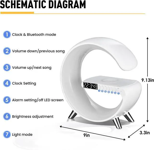 4 in 1 Multifunctional Wireless Charging Atmosphere Light: Newly upgraded G-shaped design. The lamp is not only an atmosphere light, Bluetooth speaker, music, sleep light, atmosphere light, bedside light, glare effect, Bluetooth audio, clock, alarm clock and other functions. You can use this great light while working, studying, reading and sleeping.