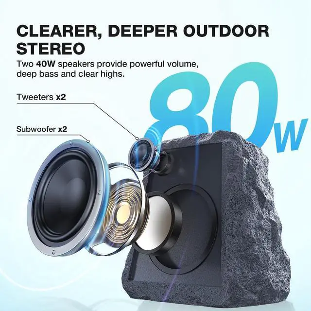 Enjoy Rich Sound: Our wireless outdoor speaker features a dual-driver system (40W bass + 40W treble) delivering powerful, balanced sound with 80W total output - ideal for outdoor parties and gatherings