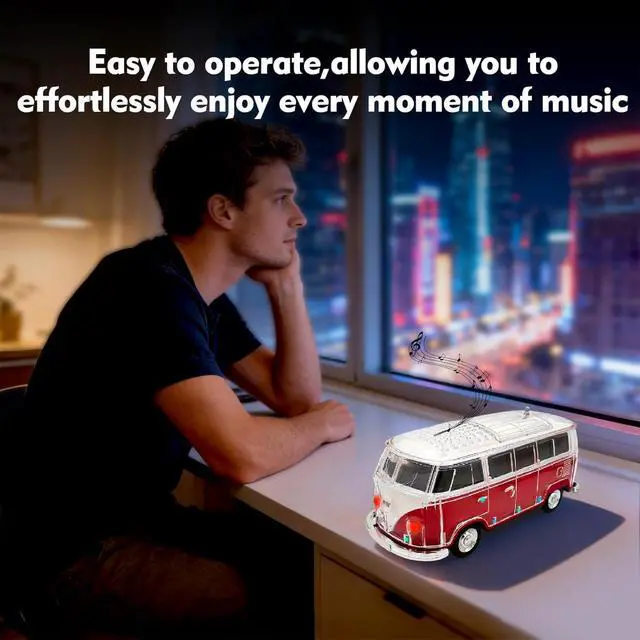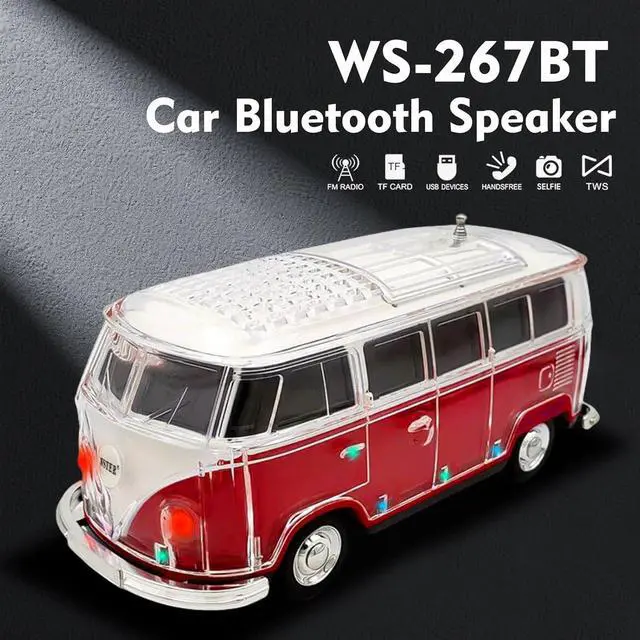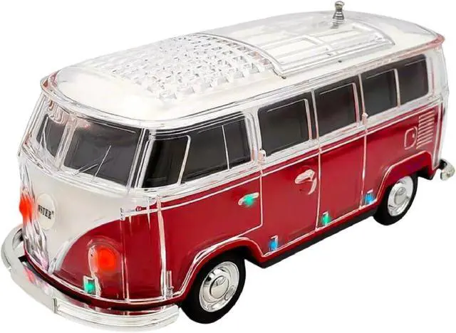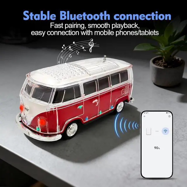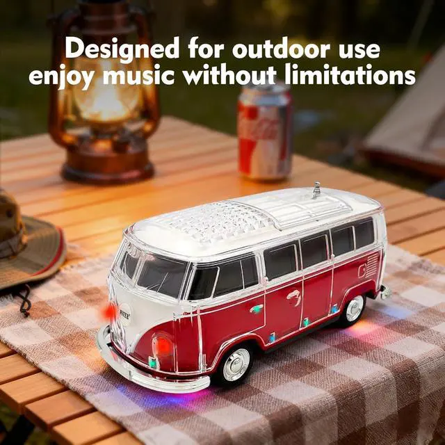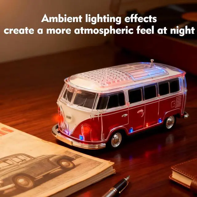 Creative Mini Bus Design Unique car-shaped speaker with transparent body and eye-catching style. This portable speaker bluetooth is compact, decorative, and ideal for car lovers, parties, and mini speakers bluetooth wireless use