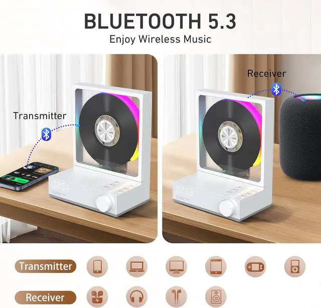 Bluetooth 5.3 & AUXWirelessly stream Hi-Fi sound to speaker or headphones. Built-in Bluetooth receiver/transmitter and AUX-in for versatile connectivityTips: It comes with a built-in wireless Bluetooth receiver and transmitter