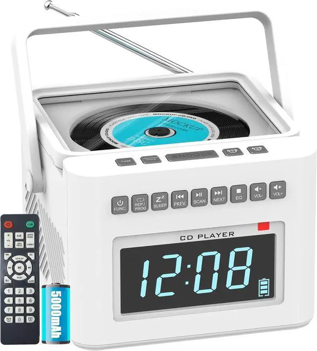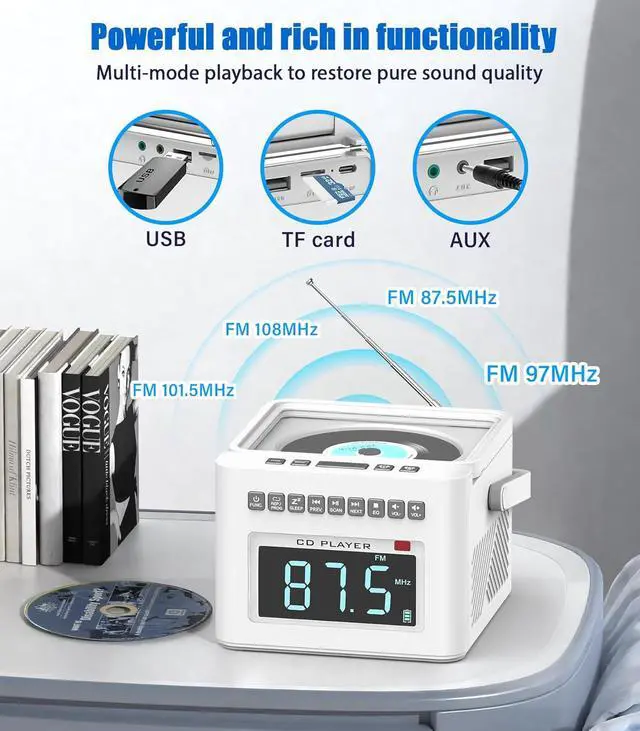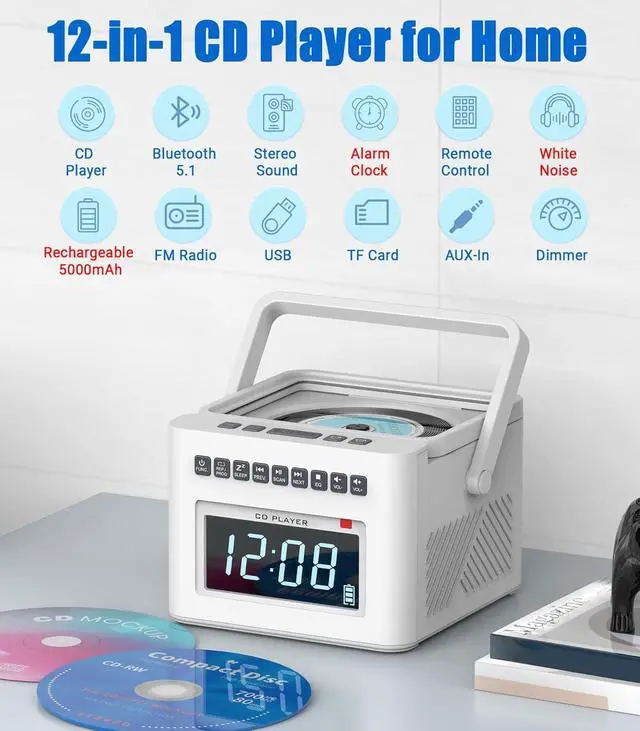 All-in-One CD Player Alarm Clock for HomeMore than just a boombox cd player, this clock radio with CD player blends classic music playback with modern convenience. Play CDs, CD-R/RW, MP3/WMA files, or stream wirelessly via Bluetooth 5.1. Listen through FM radio, AUX, USB, or TF card, or relax with 8 white noise tracks. Whether youre unwinding at home or hosting a backyard BBQ, this CD player alarm clock brings music to every moment.