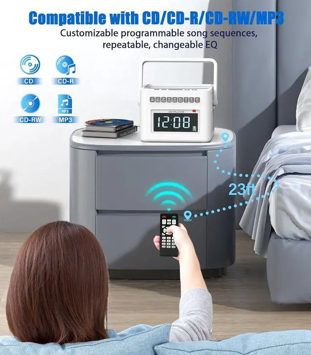 Ready to Play Everything IncludedThis portable boombox CD player clock radio combo comes with a remote, USB-C cable, AUX cord, and adapter no extra purchases needed. Loved by families, grandparents, and music lovers alike, its your all-in-one music and sleep solution.