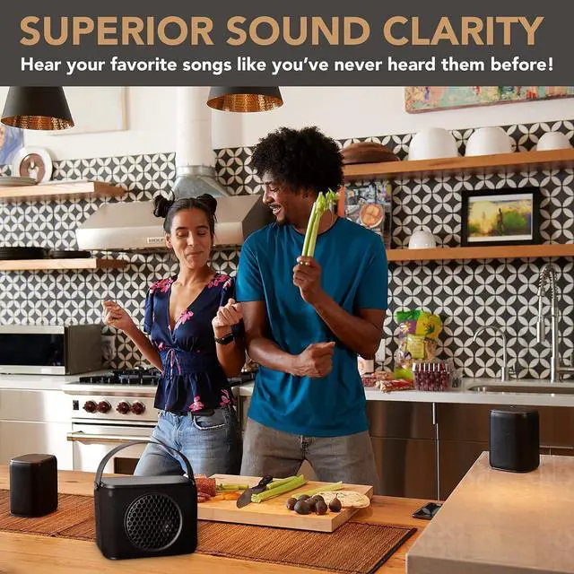 WIRELESS CONNECTIVITY AND SIMPLE CONTROLS: Connect your favorite media with 1-Tap Bluetooth pairing or 3.5mm auxiliary jack. Toggle Bluetooth ON or OFF with one touch. Responsive LED touch controls and physical switch for Power & Channel Selector.