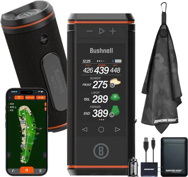 Bundle Includes: Bushnell Golf Wingman HD GPS Speaker, Signature Series Golf Towel, and Power Bundle