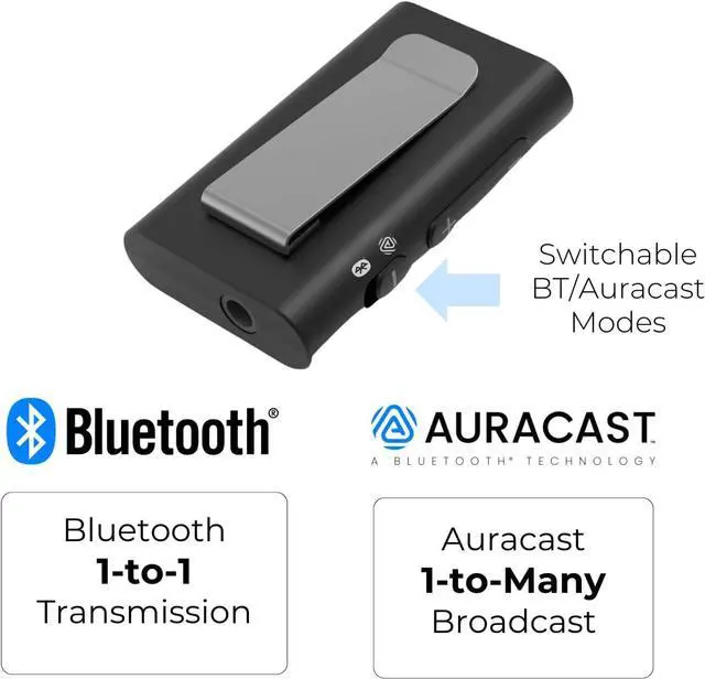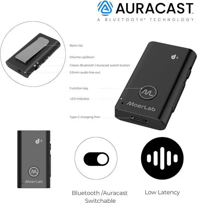 Auracast & Bluetooth Dual-Mode Receiver MoerDuo Plus supports both Auracast broadcast audio and Bluetooth Classic, allowing flexible listening from next-generation broadcasts or traditional Bluetooth sources.