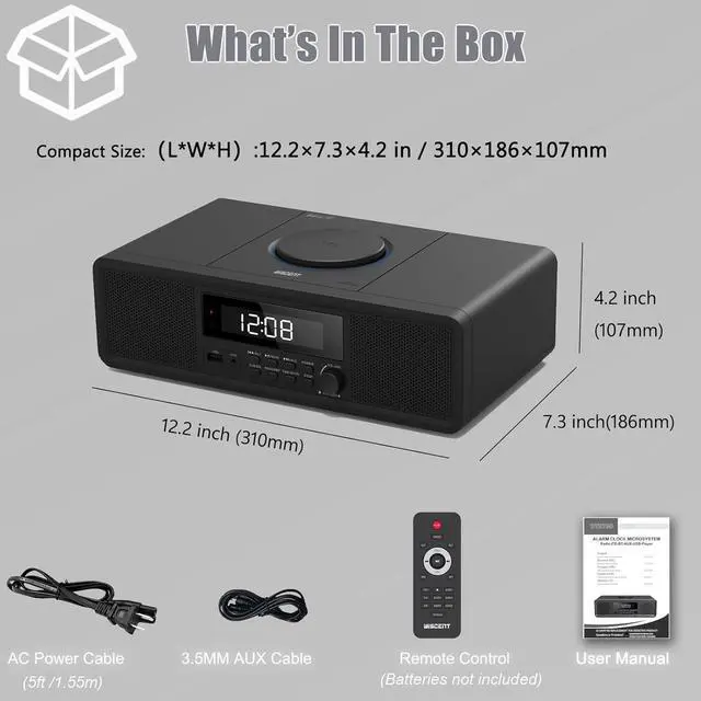 Top-Loading CD Player:compatible with Playback your favorite CD/CD-R/CD-RW/Audiobooks CD/CD-MP3, with shuffle, repeat and program functions. All in a stylish, compact and modern design that fits perfectly into any home environment.