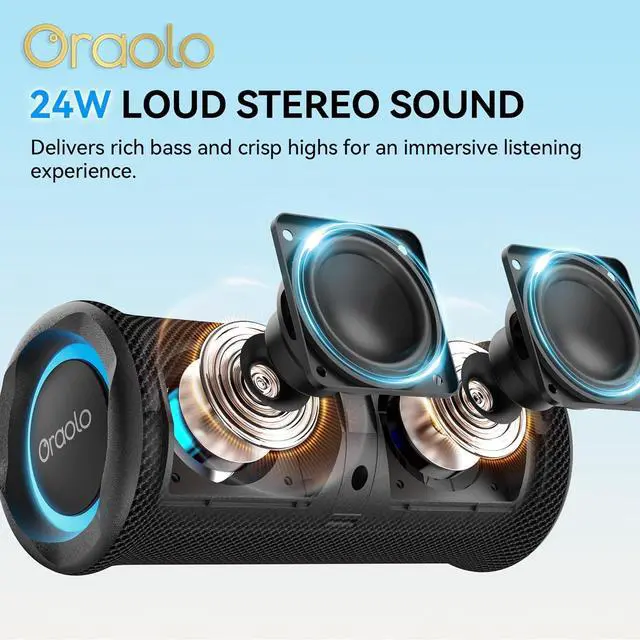 24W High-power & Immersive Stereo SoundOraolo bluetooth speakers are equipped with powerful 24W stereo audio drivers, perfectly achieving stereo sound effects and high volume output. Advanced acoustic technology can minimize distortion, filling the entire room or outdoor space with crystal clear details, bringing a truly immersive listening experience. The advanced stereo sound field creates a true 360 ° immersion, allowing every beat to revolve around you.