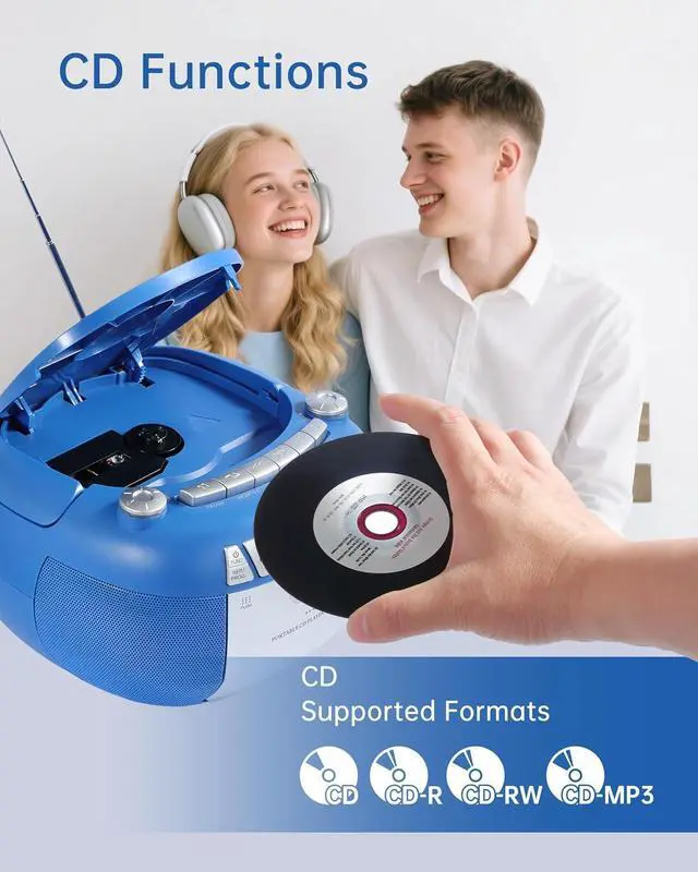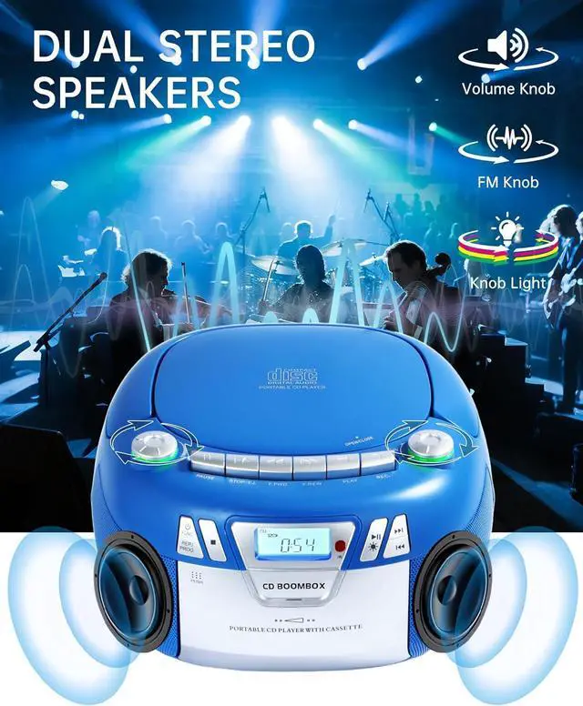 The Ultimate All-in-One Entertainment Hub Your All-in-One Music Hub: Bluetooth 5.3, USB, and CD Player Boombox Retro Vibe Meets Modern Tech Pure Nostalgia: Portable Boombox with Cassette Player and Recorder Rich, Room-Filling Stereo Sound Crystal-Clear Stereo Audio: Dual Speaker Boombox & FM Radio Your Music, Anywhere You Go The Perfect Soundtrack for Any Occasion: For Camping, Picnics & Home Effortless Control for All Ages Simple & Intuitive: Easy to Use Boombox with a Clear Digital Display Rediscover Your Entire CD Collection Versatile CD Player: Plays CD, CD-R/RW, and MP3-CDs Set the Mood with Dynamic Lights Create an Atmosphere: Boombox with Customizable LED Knob Lights