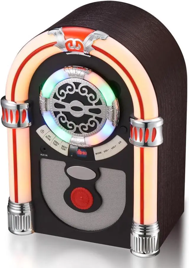 Sound That Moves You:Experience audio like never before with our Quick Touch EQ Modes. A simple touch of a button activates multiple preset EQ settings - Classic, Jazz, Vocal, Flat, Pop, and Rock. Tailor the sound to your mood and the genre of music you're listening to. The tabletop jukebox is fitted with 2 powerful 16 - Watt speakers that deliver ultra - fidelity stereo sound. Whether you're hosting a party and want to blast your favorite anthems or relaxing at home with some soft melodies, the sound quality will leave you in awe.