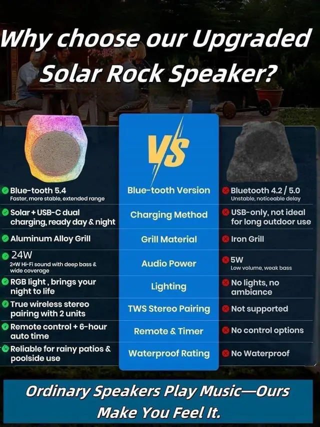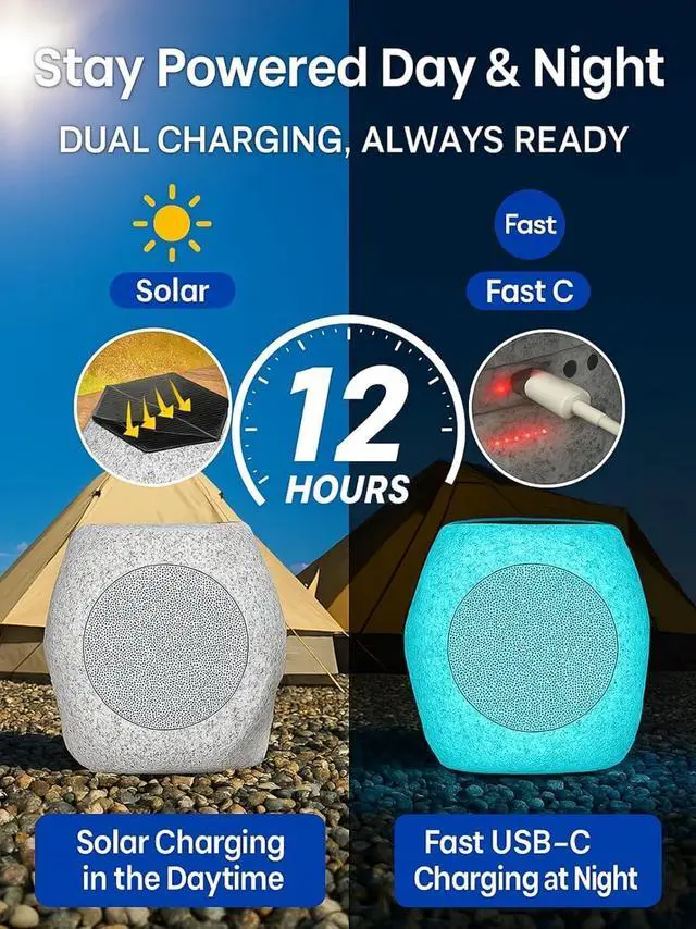 SolarPowered + USBC FastCharge 16 Hr PlaytimeHighefficiency panel keeps music rolling; 2 hr quickcharge via USBC delivers 16 h of continuous playperfect for camping, BBQ, beach, tailgate or everyday yard use.