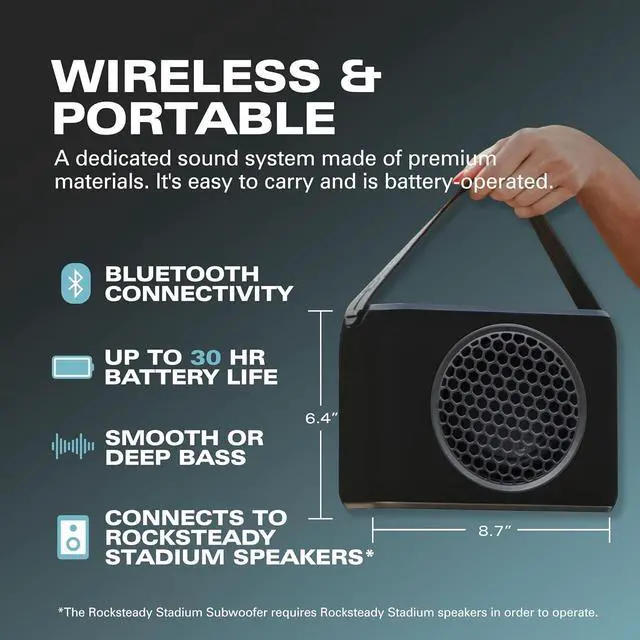WORLD'S FIRST PORTABLE SUBWOOFER: Transform your sound experience with the Rocksteady Stadium Subwoofer. Wireless subwoofer connects with Rocksteady Stadium Speakers to create an immersive and expansive listening area.