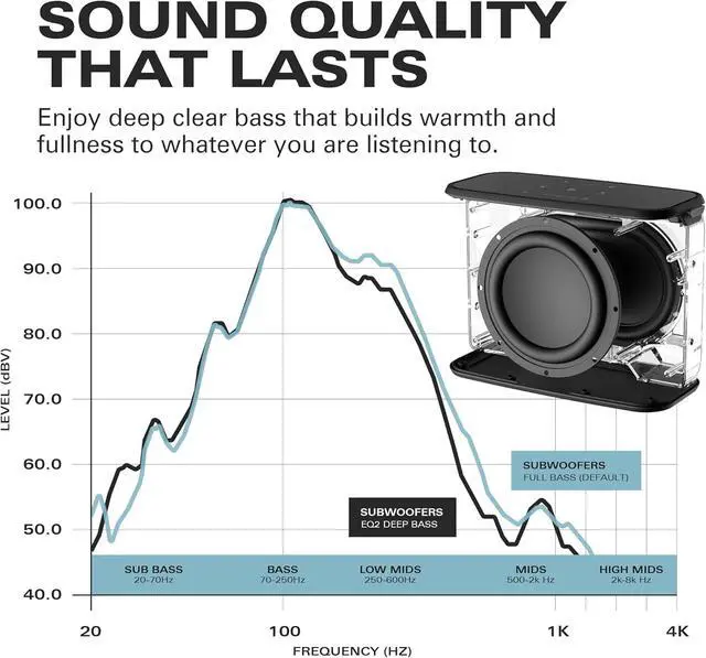 LONG BATTERY LIFE & RANGE: Long-lasting subwoofer battery has up to 30 Hours playback on full charge, and connection range up to 150 feet.