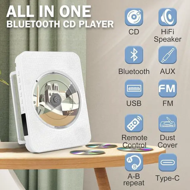 7-in-1 Multi-Function CD Player: This portable CD player packs powerful features including CD playback, Bluetooth reception, FM radio, USB, AUX input, timer function, and repeat playback. Its CD functionality offers broad compatibility with five disc formats: CD, CD-R, CD-RW, MP3, and WMA