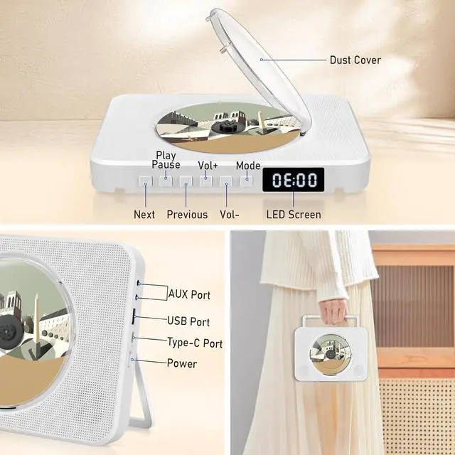 Unique Design: The rear of this home CD player features a built-in stand, allowing stable placement at multiple angles on your desk or space-saving wall mounting. The desktop CD player includes a front dust cover to effectively protect discs from damage or dust accumulation. Enjoy remote control operation within a 10-meter range for effortless music enjoyment