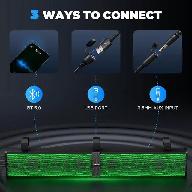 • Strong & Waterproof Soundbar: Built for the outdoors, this rugged ATV soundbar is IP66 waterproof and dust-resistant. The heavy-duty housing protects the speakers from mud, rain, sand, and harsh weather so you can ride with zero worries