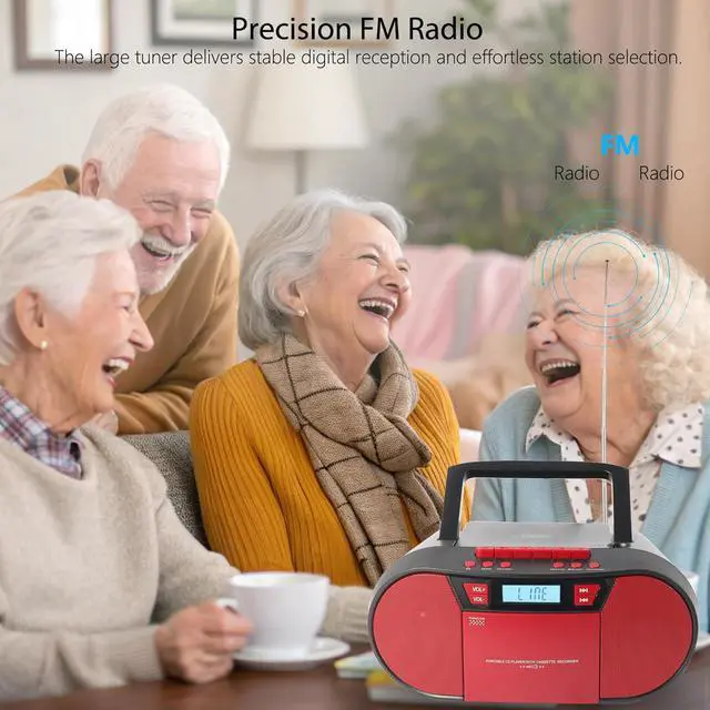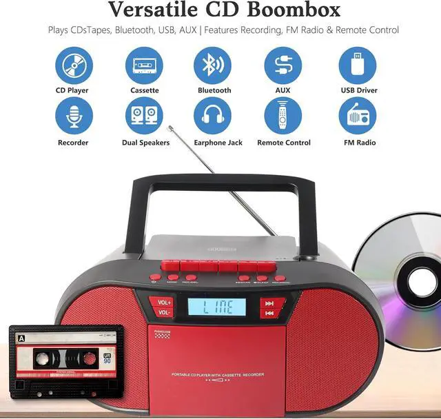 All-in-One Retro Music SystemRelive the golden era of music with a modern twist! This boombox portable cd player combines classic CD/cassette playback with Bluetooth, USB, and TF card support, plus FM radio(no AM)all in one sleek package. Perfect for audiophiles who crave nostalgia without sacrificing today's convenience