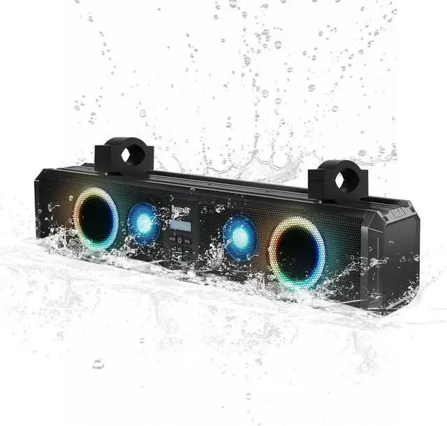 Easy to Install: Comes with adjustable drill-free brackets, enabling installation in 20 minutes or lessno professional tools needed. The Soundbar measures L26.3'' x W4.5''x H5.1'' and is suitable for 1-2 inch roll cage (UTV, ATV, boat, or golf cart). Please make sure the roll cage is installed on a horizontal line
