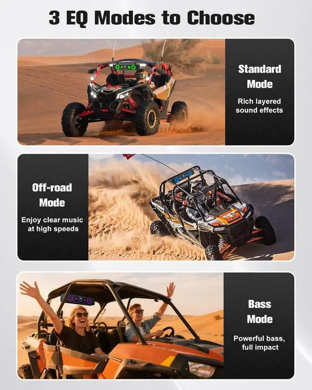110 dB Loud + 3 EQ Modes: This UTV soundbar delivers 110 dB clear sound perfect for enjoying music during high-speed drives paired with 3 tailored EQ modes: Standard mode for rich, layered sound; Off-road Mode (optimized for high speeds) for clear, audible music on fast trails; Bass Mode for powerful, punchy low-end. Equipped with 2 woofers, 2 tweeters, and 2 mid-range speakers, it ensures stable sound quality for pop, rock, and more genres