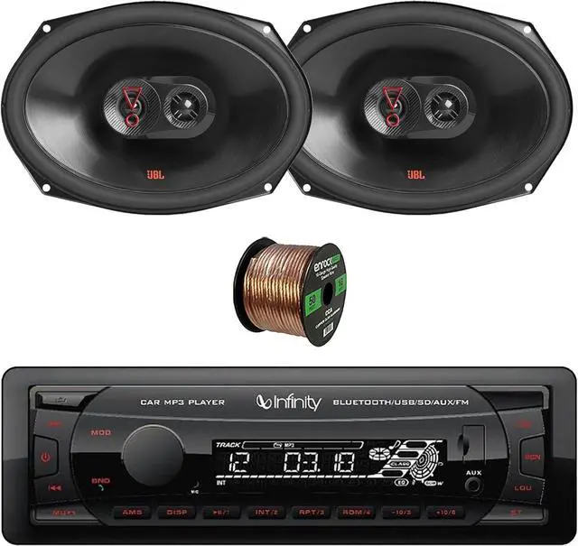 PACKAGE BUNDLE INCLUDES: Infinity Alpha 100 Single DIN Bluetooth USB/AUX SD FM Radio MP3 Player Digital Media Car Audio Receiver, JBL Stage3 9637F 6"x9" 370 Watts Peak Power 3-Way Automotive Speakers (Pair), Enrock 50 Feet 16 Gauge Speaker Wire