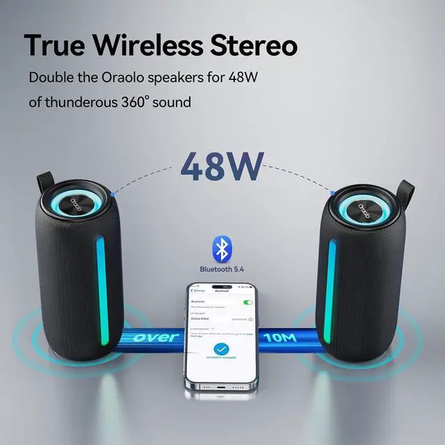 Bluetooth 5.4 & TWS PairingFeaturing advanced Bluetooth 5.4 technology, it ensures fast and stable transmission, providing you with an uninterrupted music experience. Effortlessly pair two Oraolo portable speakers to achieve a powerful 48W 360° surround sound experience. This true wireless stereo setup not only doubles the audio output but also expands the sound field, making every beat and melody more vivid and captivating.