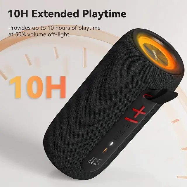 IPX6 Waterproof & 10H PlaytimeIPX6 Waterproof makes this wireless speaker suitable for outdoor activities. Take it to your cruise ship, riding, boating, or party and no worries about weather and outdoor conditions, keep the music on your way.Besides, enjoy up to 10 hours of continuous playtime at 50% volume without the lights.