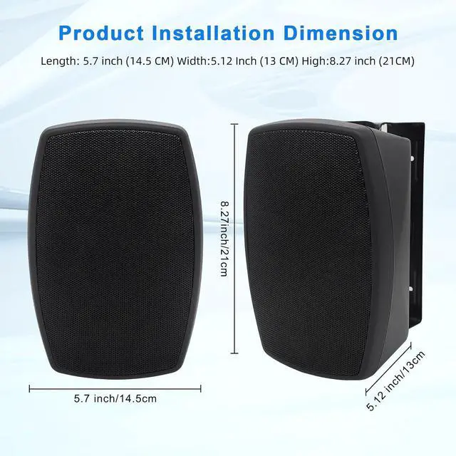 Product Size:145*210*130mmWoofer + Tweeter: 4 inch + 1 inchProduct material: ABSWaterproof grade: warterproofBluetooth distance: 50 ft.Bluetooth version: 5.3 All-weather wall-mounted speakers Enjoy the audio wherever it is placed Universal Indoor/Outdoor Installation Easy to set up and use 1-Easy-to-operate location To ensure you have the best experience, please note the following: norm