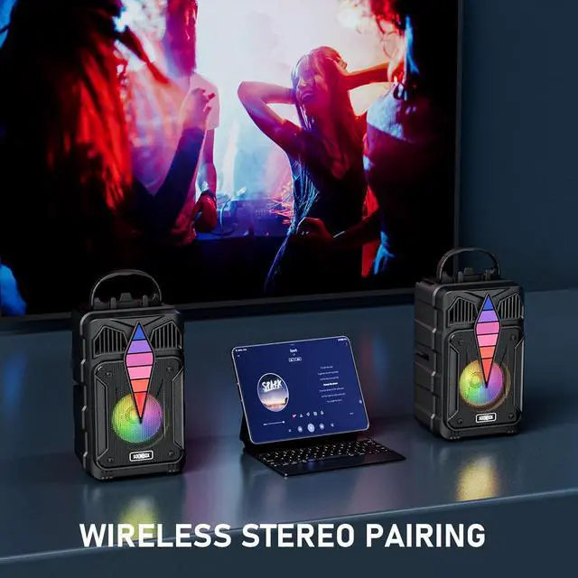 Colorful Light ModeThis speaker comes with voice-activated RGB multi-color rhythm light, allowing you to switch between different coloured lights at will. Enjoy the joy of the party with colorful lighting and wonderful music, moving with the beat of the song, charming and romantic, allowing you to immerse yourself in the colorful music light show, perfect for family gatherings, Christmas performances, and various outdoor or indoor party activities.