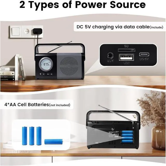 TWO Power OptionsCompatible with 4 UM-11/5V batteries (not included), and features a Type-C 5V DC input port. Batteries are widely available in households and stores for easy replacement. Enjoy uninterrupted radio listening even during power outageswhether at home, on the go, or in emergencies, this AM/FM radio is your reliable audio companion!