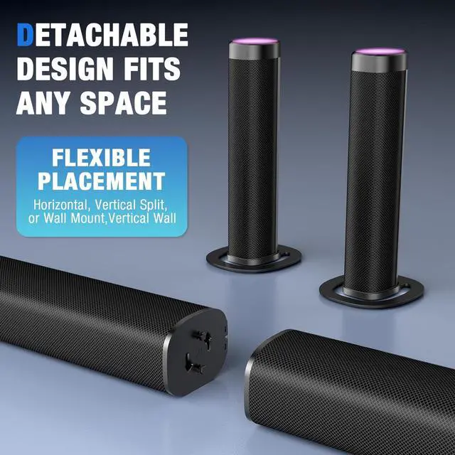 Built-in dynamic RGB lighting syncs with audio to enhance your TV soundbar experience for movies, gaming, and music. This RGB soundbar has 3 modes: Music Sync for beat-driven effects, Breathe Flow for smooth color transitions, and Solid Color for single-hue ambient light. Easily switch modes or turn off RGB using the sound bar button