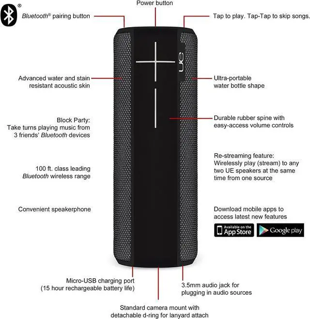 Never worry about taking the party too far. Ultimate Ears Boom 2 has 100-ft Bluetooth wireless range; 15-hour rechargeable battery; and the perfect design to bring the music anywhere; Charge time: 2.5 hours