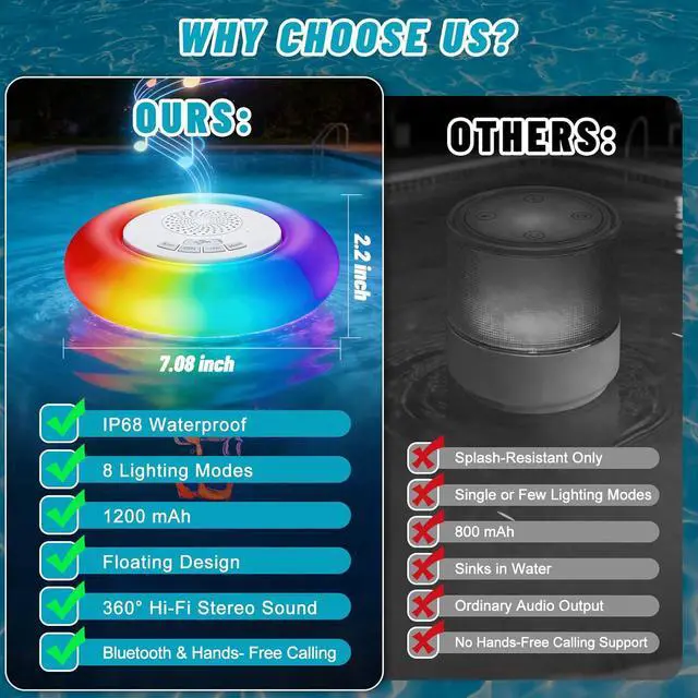 2 in 1 Floating Pool Lights & Bluetooth Pool Speaker: Upgrade your pool experience with a unique 2-in-1 design that combines vibrant floating pool lights with a powerful Bluetooth pool speaker. Enjoy stunning lighting effects and immersive music at the same timeperfect for pool parties, hot tubs, and outdoor gatherings