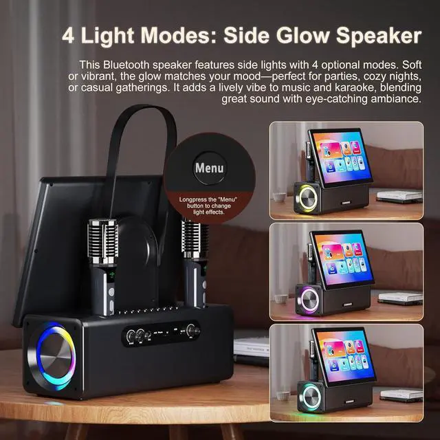 4 LED Light Modes Create the Perfect Party Atmosphere: Built-in side LED lights offer four selectable lighting modes. Whether youre hosting a party, relaxing at home, or enjoying a cozy night in, the dynamic lighting effects enhance the mood and bring extra excitement to your karaoke or music sessions.