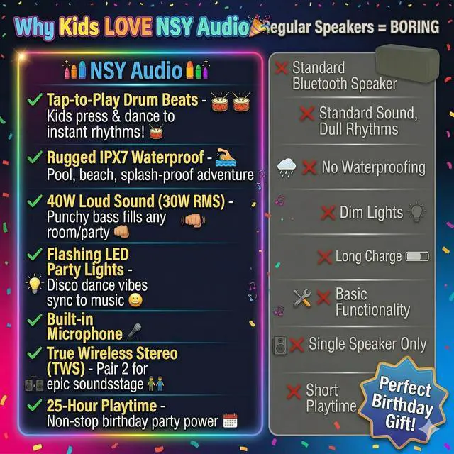Drum-pounding Beats & EQ-Powered RGB LED lights flash, pulse, and auto-sync to your musics rhythm. Transform bedrooms, patios, or pool decks into wild mini-clubs! Just quick-press the "Light Button" to toggle the light show on/off (save battery or go full disco mode in a snap).