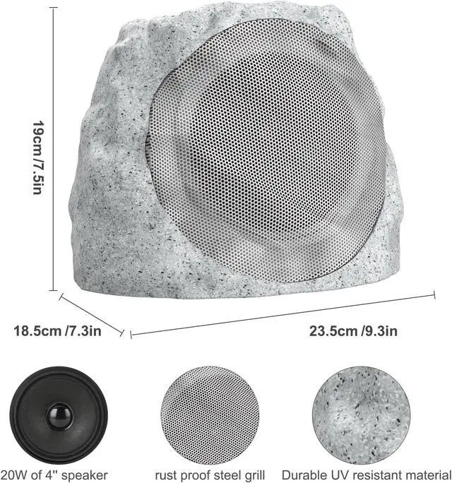 SOLAR POWERED & USB-C Rechargeable: NO wires required! Set rock speakers outdoor waterproof in your outdoor area for direct sunlight charge takes about 15h in the sun for a full charge (only 4-5h via 5V USB-C Cable). On any sunny day, can work and charge at the same time, and enjoy music for extended hours with Rock speaker