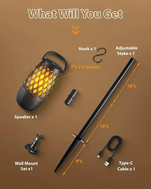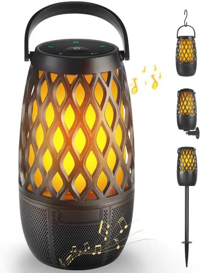 Amazing 3 Modes Flame Light-Portable outdoor bluetooth speaker with lights have 3 light models, flickering flame light, breathing candle light, and solid amber light. The portable speakers can work as an independent LED atmosphere lamp, patio light, or portable lantern. Including a set of hook, ground stake, and wall mount, which is convenient placement for home and outdoor.
