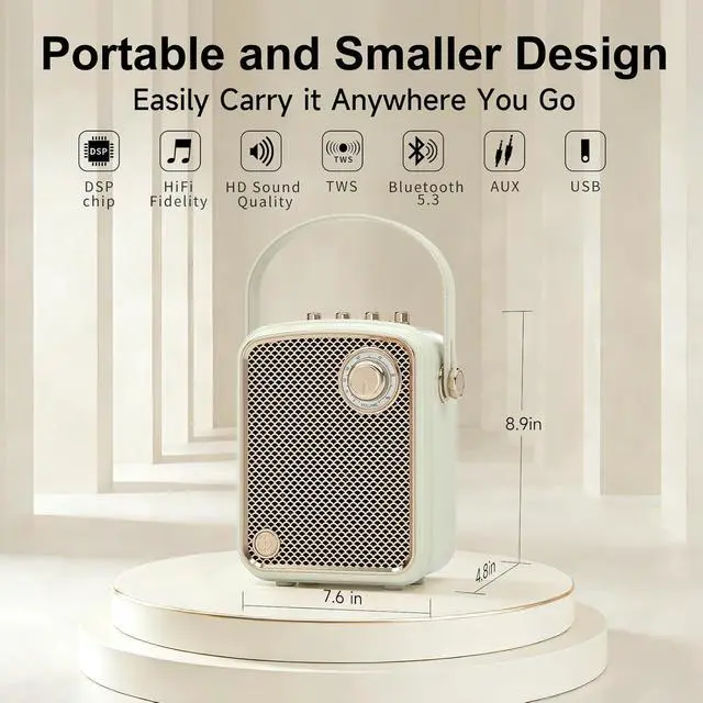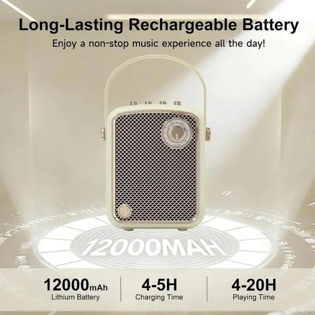 Long-Lasting Battery Life, Intuitive OperationThe speaker built-in 12000mAh high-capacity rechargeable battery provides hours of continuous playback on a single charge. The retro-style volume knob and physical buttons on the top are intuitive and easy to use, even for the elderly and children, requiring no complicated setup. A clear digital display shows the playback mode and battery level at a glance. Featuring a durable ABS shell and spray-painted finish, it is designed specifically for home and office decor. Its genuinely cute on a desk, shelf, or nightstand and works as decor as much as a speaker.