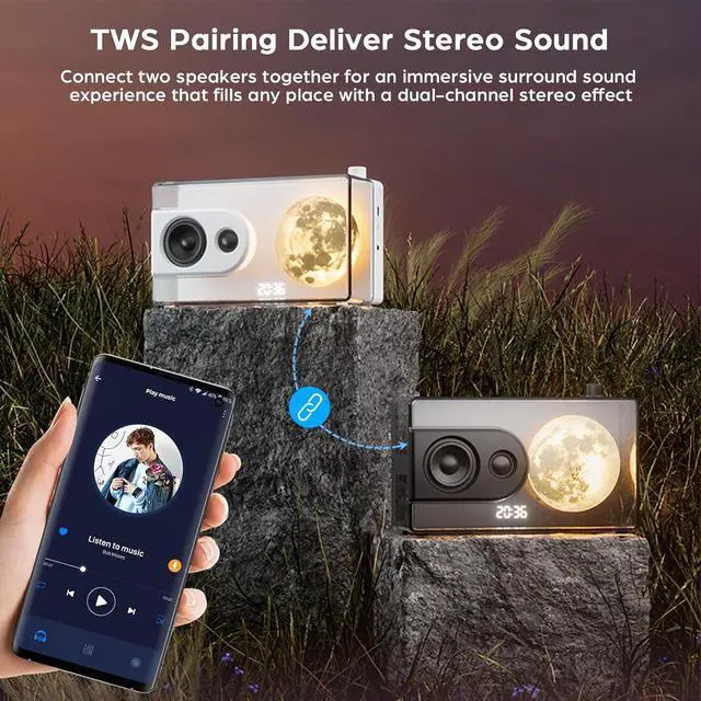 Portable Wireless Speaker - The unique rotating moon lights and transparent mecha style speaker uses square design and blends modern technology with stylish aesthetics, combining the latest digital audio tech with a romantic ambiance. With the advanced Bluetooth 5.3 technology, it could connect with your phone/tablet and offers crystal-clear highs, crisp music and deep smooth bass for a truly immersive listening.