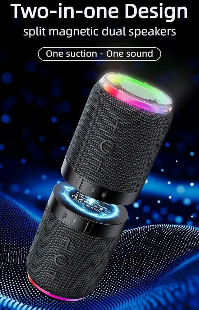 Innovative Magnetic Split Design for Versatile Sound Experience the freedom of true wireless stereo with this innovative 2-in-1 magnetic speaker system. Two individual speaker units connect seamlessly via strong built-in magnets, allowing you to use them together as a single, powerful sound source or split them apart for true stereo separation. The magnetic attachment also enables flexible placementattach them to metal surfaces like refrigerator doors, shelves, or even a bicycle frame for music wherever you go. This modular design adapts to any environment, from intimate solo listening to room-filling stereo sound