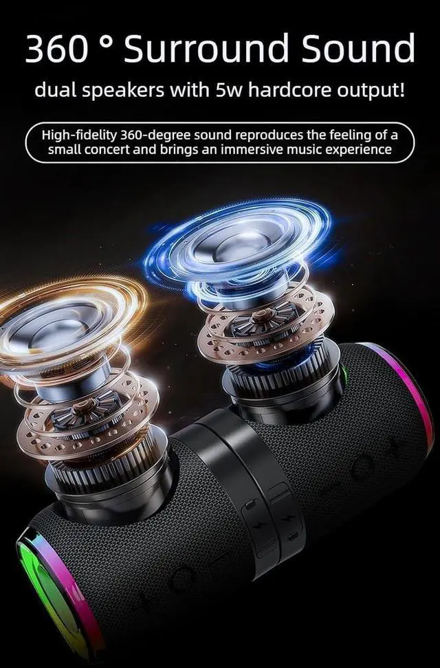 Immersive 10W Dual Stereo Sound with TWS Pairing Once paired, it provides 10W of balanced and full stereo sound. Experience clear highs, detailed mids, and surprisingly robust bass that brings your music to life. For an even more expansive audio experience, perfect for parties, outdoor gatherings, or filling larger spaces with synchronized sound