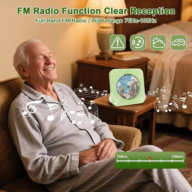 Multi-functional CD Player: 1.Desktop CD Player, 2.Bluetooth 5.0 HiFi Speaker, 3. FM Radio, 4.TF card Music Player, 5.USB Flash Drive Player, 6. 3.5mm Audio Player. Support CD, CD-G, MP3, WMA.