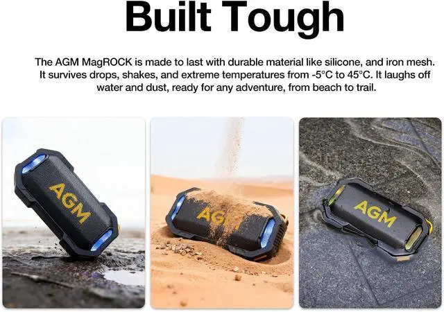 - AGM speakers magnetic design lets you stick it anywhere while IPX7 waterproofing and floating ability let it jam on water, at the pool, beach, campsite, or hiking trail. Rugged construction ensures it survives every outdoor escapade with style