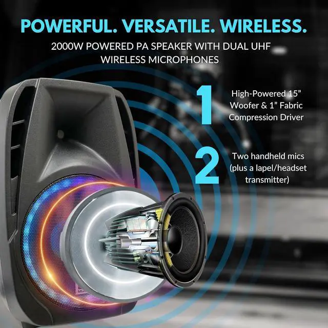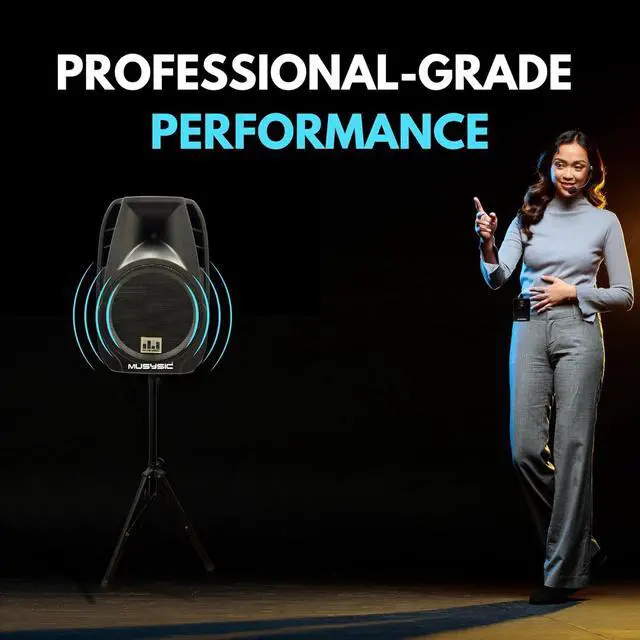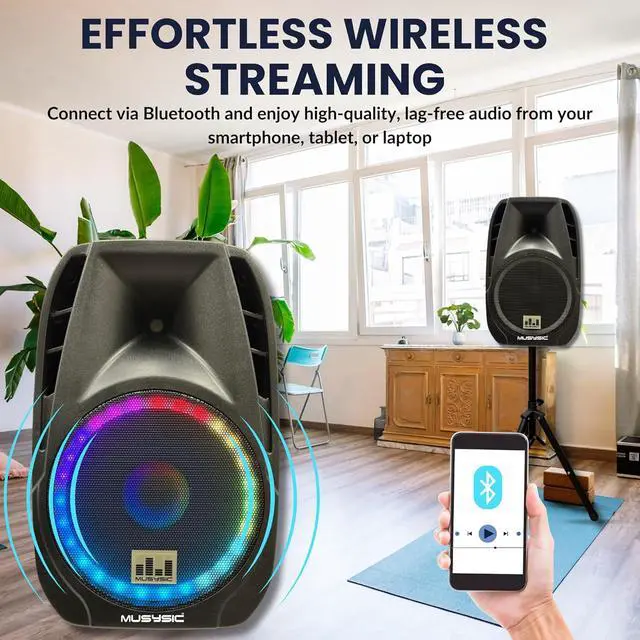 2000W High-Powered Sound The MUSYSIC MU-U15PA is a professional 15 bi-amplified Bluetooth PA speaker system, delivering 2000W peak power and 500W RMS for crystal-clear, room-filling audio.