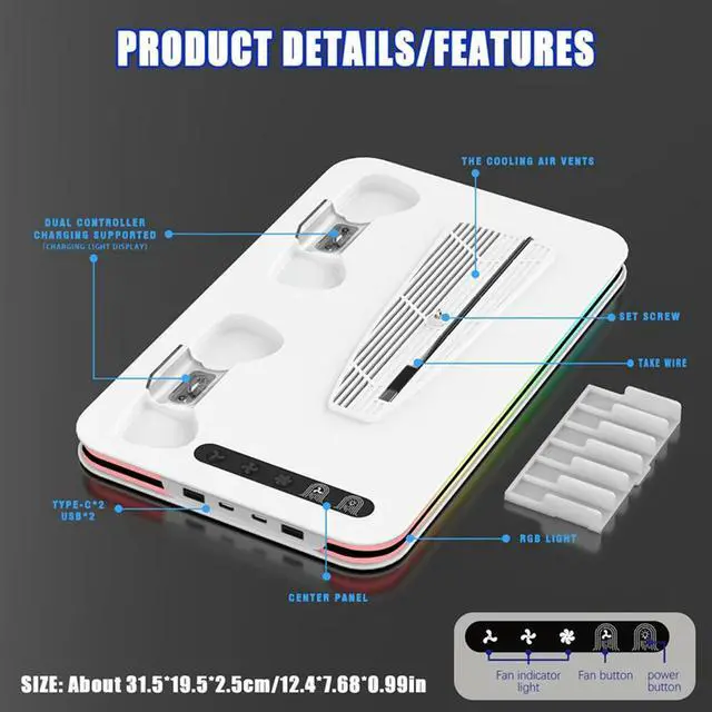 • 3In1 Cooling Stand For PS5/PS5 SLIM/PS5 PRO Charging Of Dual Controllers Adjustable RGB Lights With Disc Holder