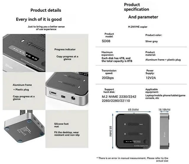 • M2 20Gbps Two Bay SSD Docking Station Dual Bay Offline USB C To NVME PCIE Docking Station One-Key Offline Clone SSD Dock US P