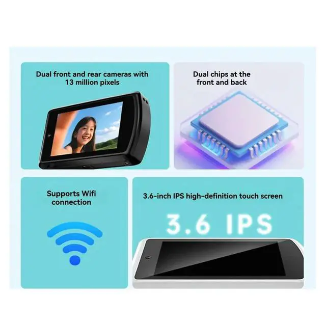 • Digital Camera 8GB 1300W AI Selfie Beauty Camera HD 3.6-Inch IPS Touchscreen Front And Rear Lenses