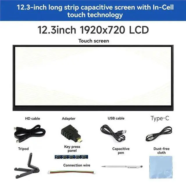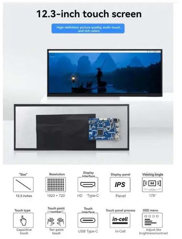 Display Screen 12.3 -Inch 10 Point Capacitive Touch IPS 1920X720 Resolution -For Rpi Compatible 178° Full View Angle