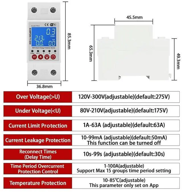 • 2P 63A Circuit Breaker with Adjustable Leakage Over Under Voltage Protection for Home Electrical Safety