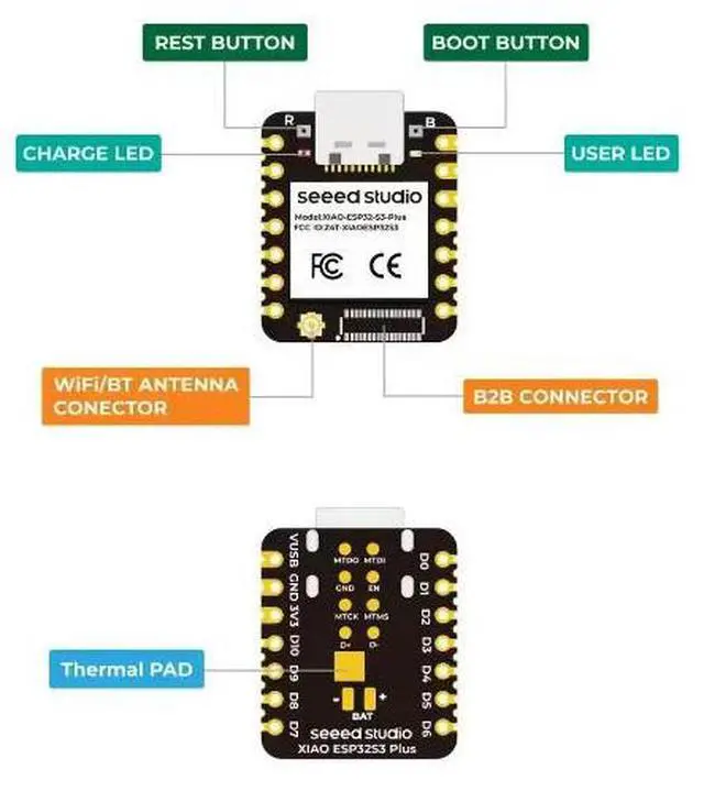 • XIAO ESP32S3 Plus - 20 GPIOs, 2.4GHz , BLE 5.0, 8MB PSRAM, 16MB FLASH, esp32-s3 dual-core, charge supported