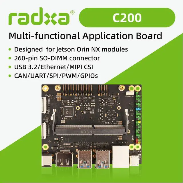 • Radxa C200 application carrier designed for Jetson Orin NX modules, ideal for edge-AI hardware building