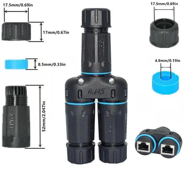 • RJ45 Female to Female 1 in 2 Out Splitter Waterproof IP68 Ethernet Outdoor LAN Cable Connector for Cat5/Cat5e/Cat6